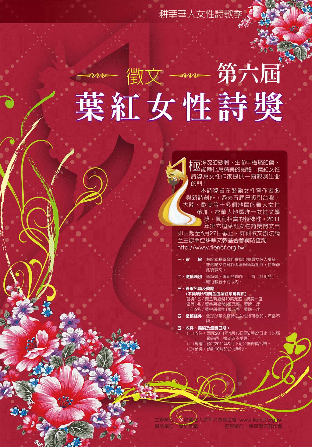2011 年第六屆葉紅女性詩獎徵文自即日起至6 月27 日截止,詳細徵文辦法請至主辦單位耕莘文教基金會網站查詢